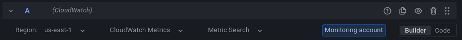 Cross-account querying is available in the plugin through the Logs, Metric search, and Metric Insights modes. After you have configured it, you’ll see a Monitoring account badge in the query editor header.