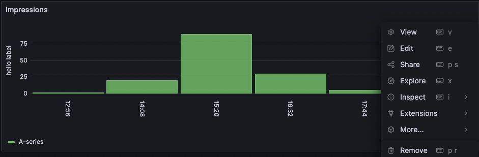 To start with an existing query from a dashboard panel, select the Explore option from the Panel menu in the upper right. This opens an Explore page with the panel’s query, enabling you to tweak or iterate the query outside your dashboard.