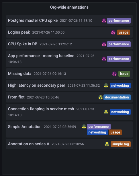 The new Annotations panel shows a list of available annotations you can use to create lists of annotated data available within your organization. Various options are available to filter the list based on the tags and on the current dashboard. This panel makes it easy to find and filter annotated data within and across multiple dashboards.