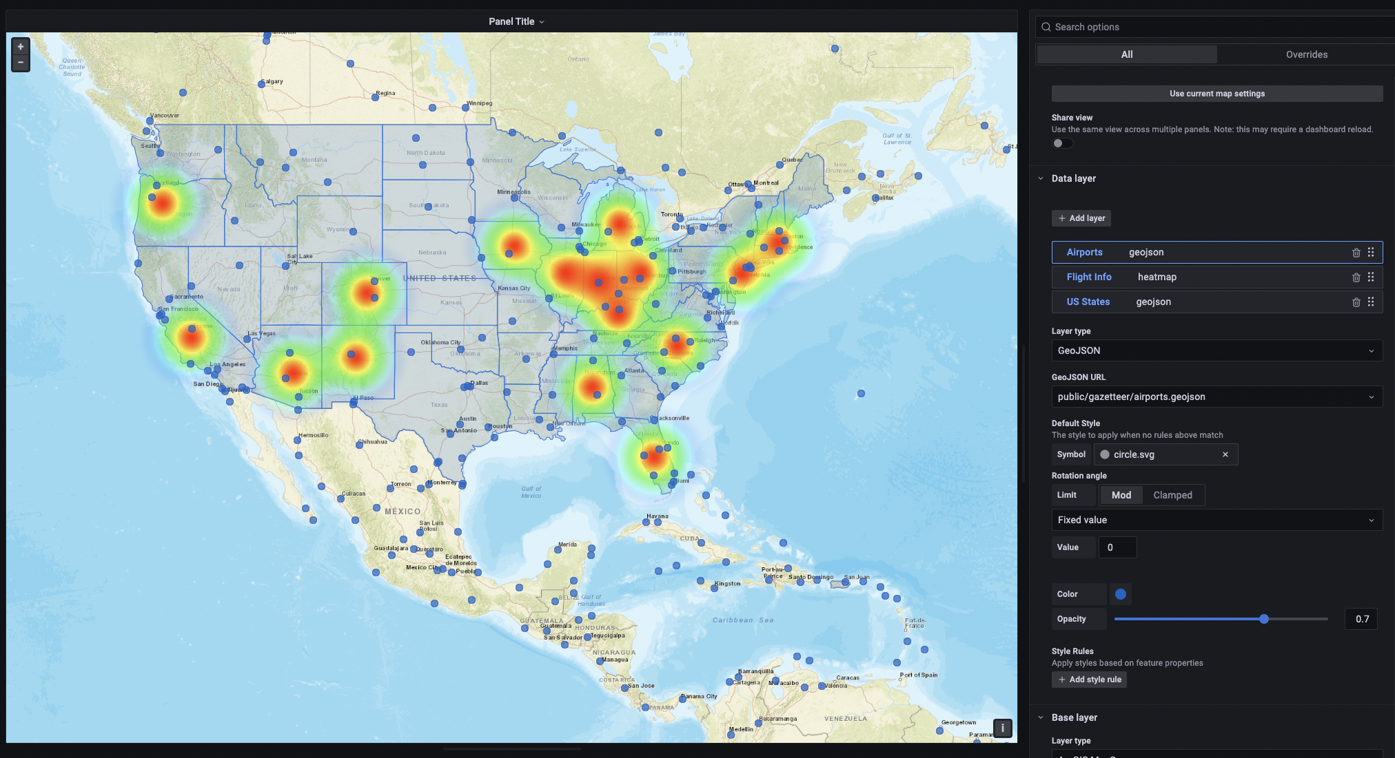 The Geomap panel has been updated to support multiple data layers. The panel can now be configured with multiple markers, heatmaps & GeoJSON layers. The layers can be individually configured, named, and re-ordered to create rich, multidimensional visualizations. Please see the documentation for details on how you can set up and configure these new configuration options.
