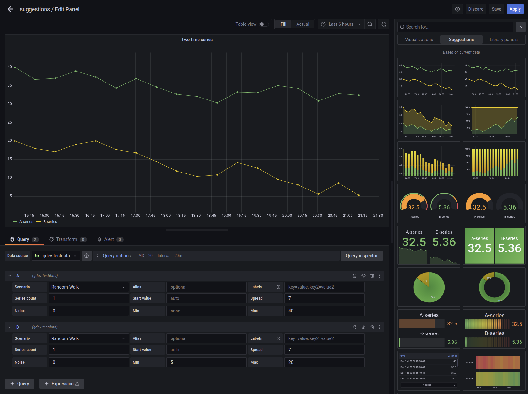 Grafana will now make suggestions for visualization types based on the current data surfaced by a query or queries in a panel. This makes seeing available, possible interpretations of your data more straightforward and can be a useful jumping-off point when building panels and dashboards with specific goals in mind.